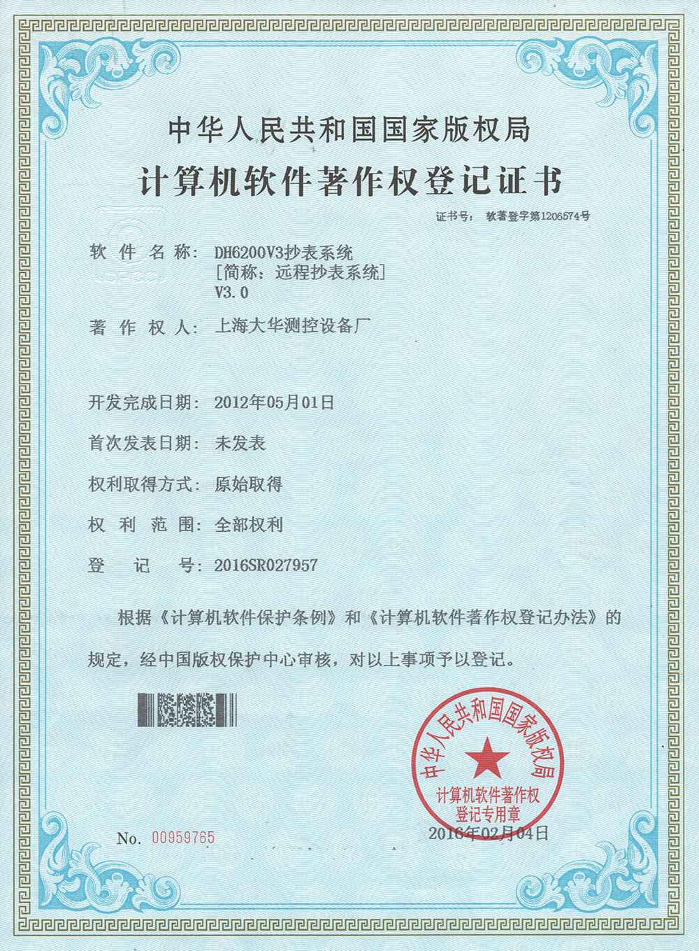 2016年7月 计算机软件著作登记证-DH6200V3抄表系统;